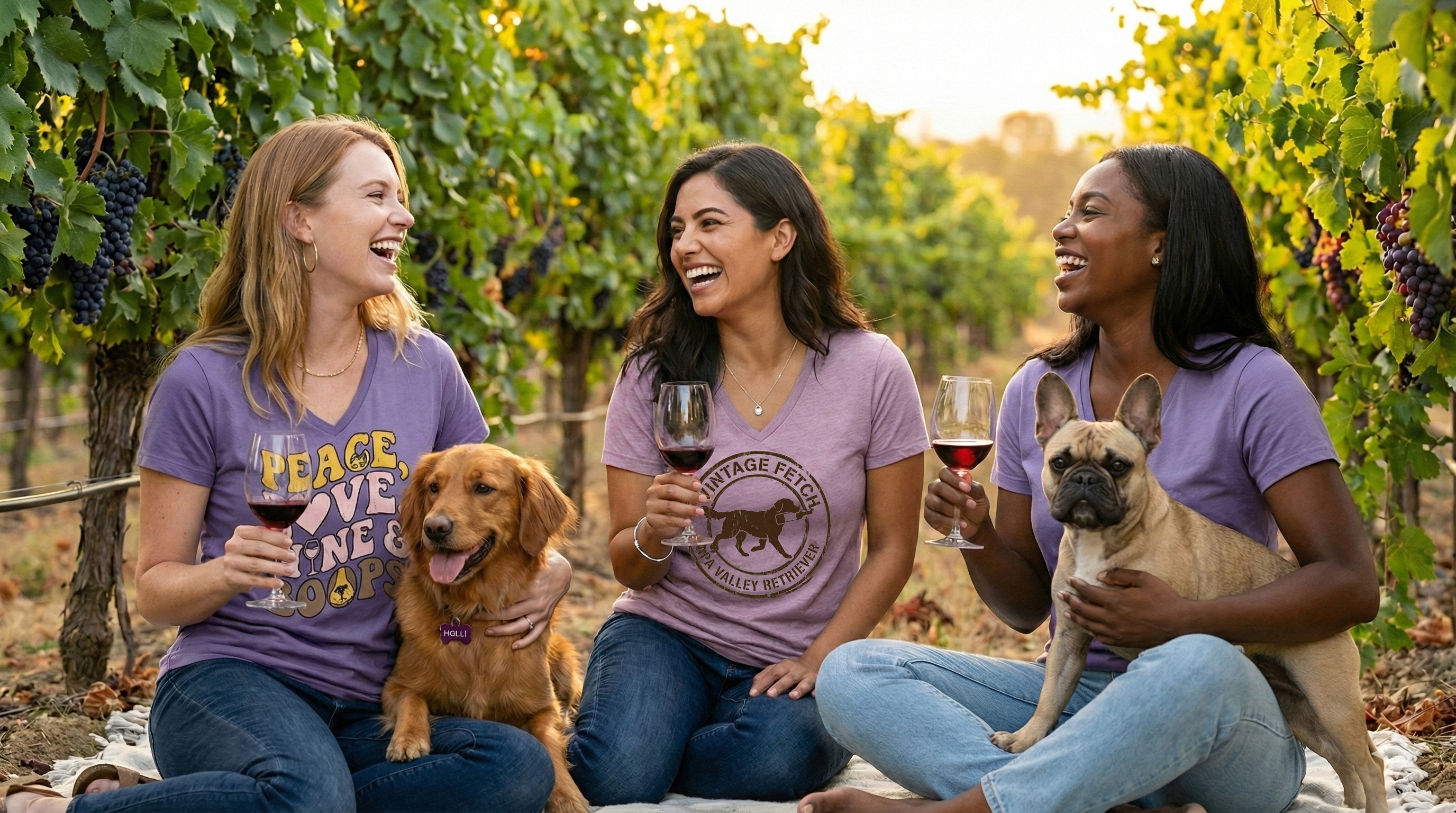 Every tee is printed in-house, right here where the sun hits just right, and we ship across the country to anyone who loves good wine, good dogs, and ridiculously soft shirts.